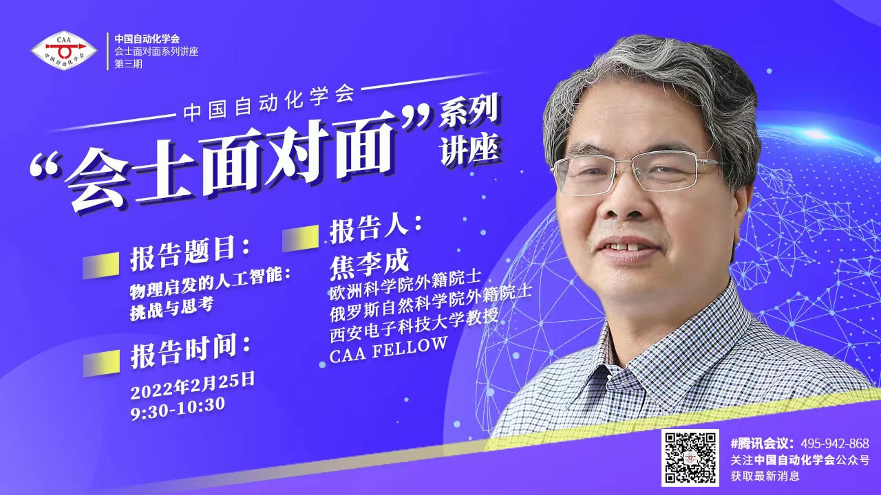 第三期会士面对面于2022年2月25日上午成功召开,西安电子科技大学焦李成教授作题为“物理启发的人工智能:挑战与思考”的报告。