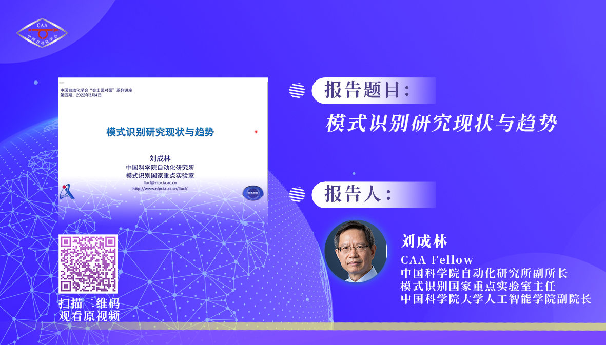 第四期会士面对面于2022年3月4日上午成功召开,中国自动化学会会士,中国科学院自动化研究所副所长、模式识别国家重点实验室主任,中国科学院大学人工智能学院副院长刘成林作题为“模式识别研究现状与趋势”的报告。