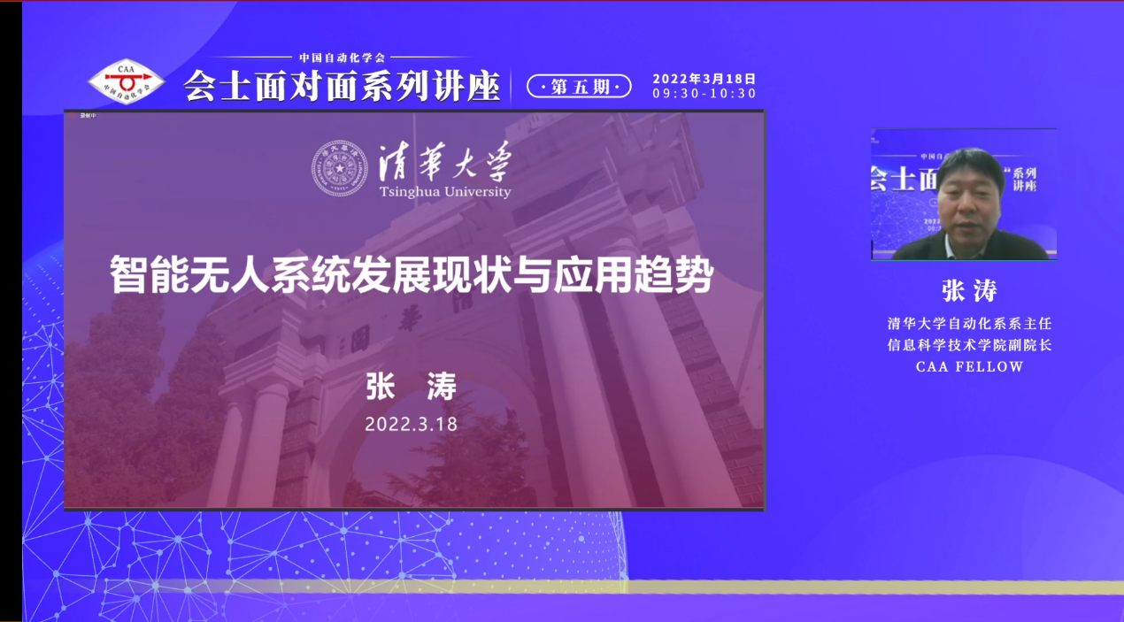 第五期会士面对面讲座于2022年3月18日上午成功召开,中国自动化学会会士、清华大学自动化系系主任,信息科学技术学院副院长张涛教授带来题为“智能无人系统发展现状与应用趋势”的报告。