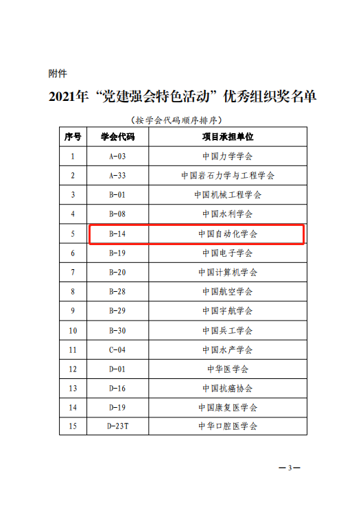 2021 年中国科协科技社团党委继续实施“党建强会计划”项目,围绕着落实党史学习教育“我为群众办实事”的要求,共有68家学会党组织承担“追寻红色足迹,开展党建强会特色活动”。为表彰先进,发挥典型示范作用,在项目验收总结的基础上,科技社团党委开展了“2021 年‘党建强会特色活动’优秀组织奖”评选工作,经过项目承担单位网络互评、专家评选等环节后,共有15家学会党组织获评优秀组织奖,中国自动化学会党组