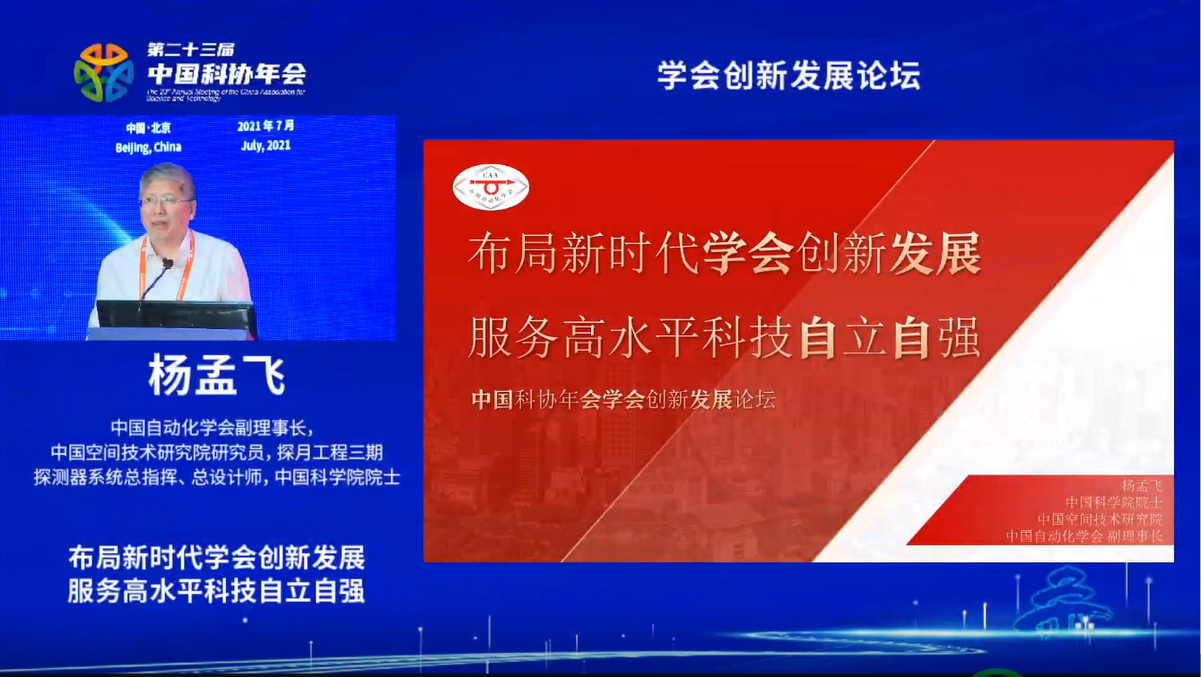 第二十三届中国科协年会——“学会创新发展论坛”今日于北京召开,中国自动化学会副理事长杨孟飞院士代表学会出席大会,并做题为“布局新时代学会创新发展,服务高水平科技自立自强”的报告。