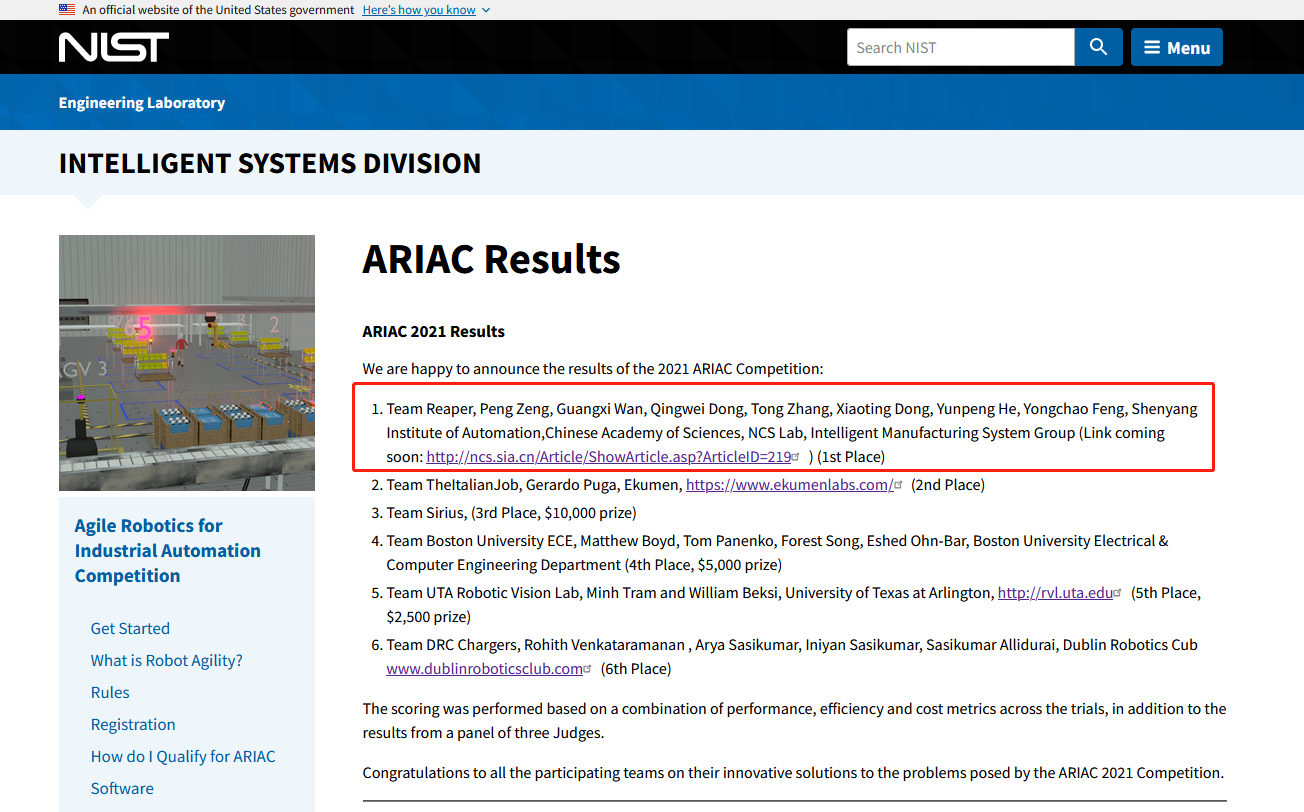 7月15日,由美国国家标准与技术研究院举办的2021年度面向工业自动化的敏捷机器人集群国际挑战赛发布了比赛结果,中国科学院沈阳自动化研究所Reaper团队,在参赛的60余支代表队中脱颖而出,荣获冠军。