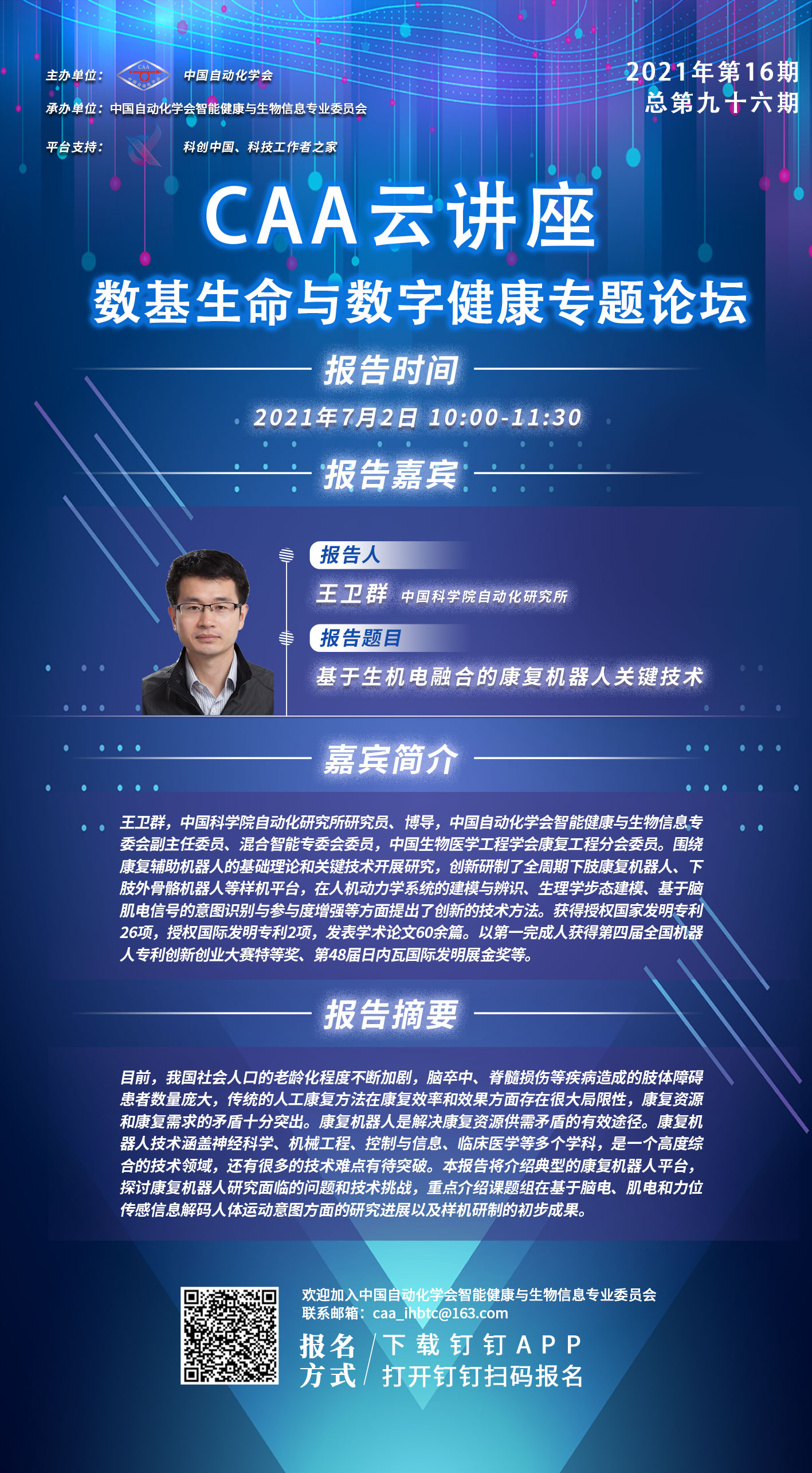 由中国自动化学会主办,CAA智能健康与生物信息专委会承办的CAA云讲座—数基生命与数字健康专题论坛第四场讲座,将于2021年7月2日上午10:00-11:30举行,由中国科学院自动化研究所王卫群研究员带来报告:基于生机电融合的康复机器人关键技术。精彩内容,敬请期待!