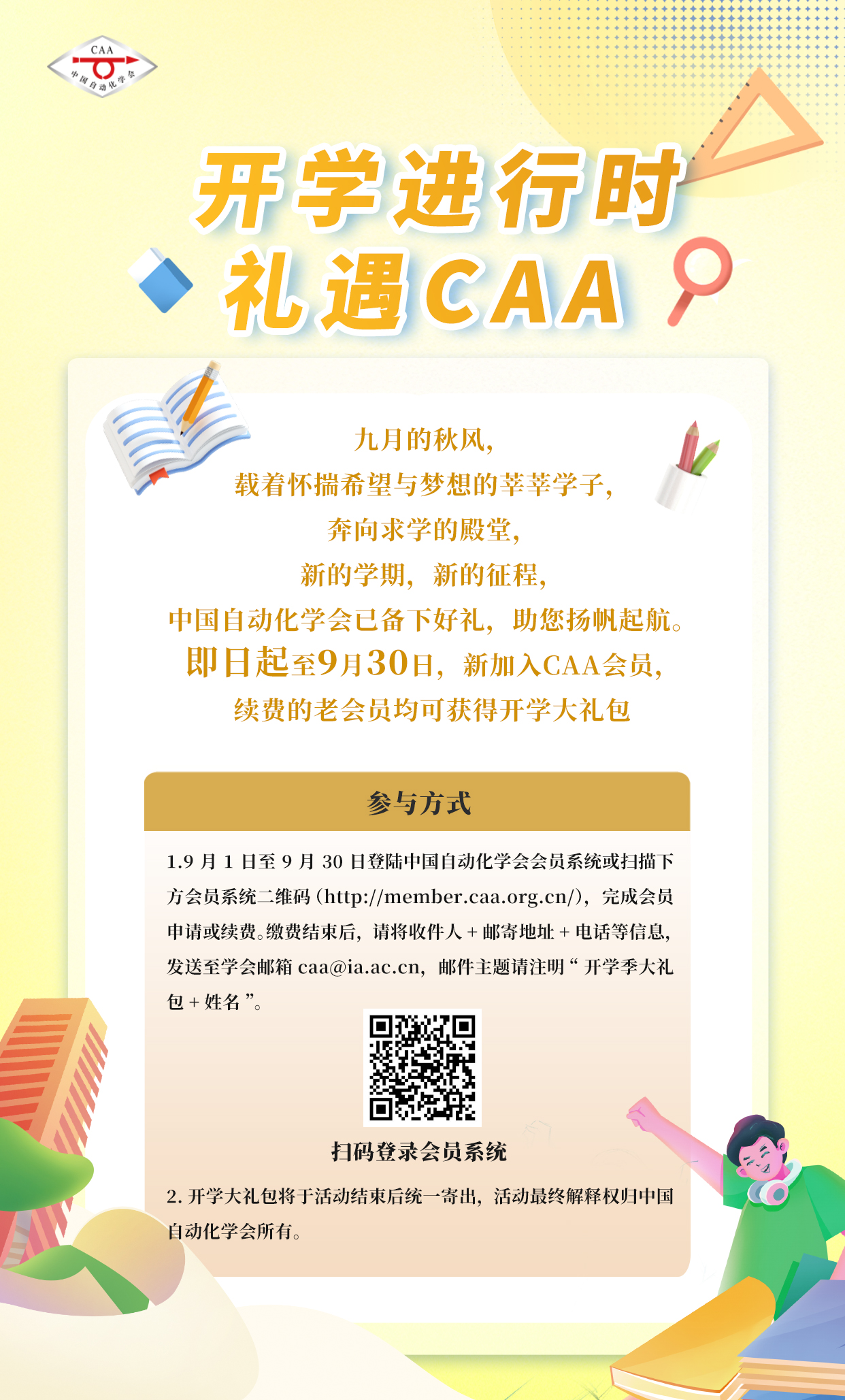 1.9月1日至9月30日登陆中国自动化学会会员系统或扫描下方会员系统二维码(http://member.caa.org.cn/),完成会员申请或续费。缴费结束后,请将收件人+邮寄地址+电话等信息,发送至学会邮箱mailto:caa@ia.ac.cn,邮件主题请注明“开学季大礼包+姓名”。