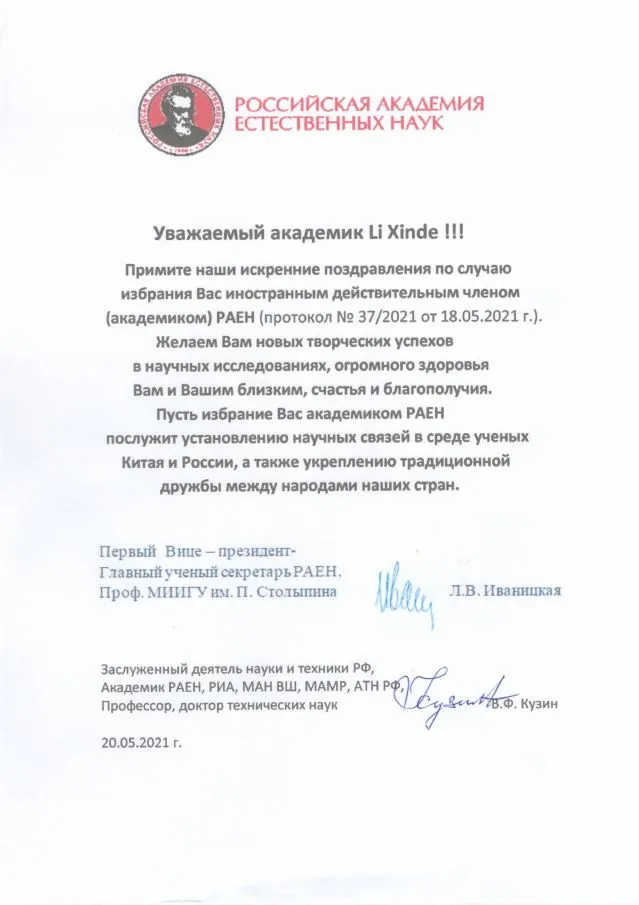 近日,俄罗斯自然科学院(Russian Academy of Natural Sciences,RAEN)O.L.Kuznetsov院长向中国自动化学会会员、东南大学自动化学院李新德教授发来贺信,祝贺他当选为俄罗斯自然科学院外籍院士。