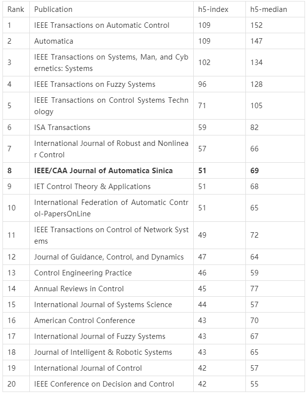 近日,谷歌学术出版物影响力榜单——学术计量指标(Scholar Metrics) 2021版发布。IEEE/CAA Journal of Automatica Sinica稳居工程和计算机科学领域的自动化与控制理论学科顶级出版物(Top Publications)榜单,h5指数为51,排名跃升至第8,首次进入全球前十,是该学科TOP20出版物中世界最年轻且唯一中国主办的期刊。 谷歌学术计量基于学术出版物过去五年的h指数计算,综合考虑发文量和被引量,具有不易操控、范围广泛等特点,是出版物重要学术评价指标之一,自2012年起每年发布一次。谷歌学术表示,该计量指标为快速评估学术出版物近年发表文章的显示度和影响力提供了一种便捷方式。 谷歌学术计量指标含义:h指数(h-index):出版物所发表的 h 篇文章每篇至少都被引用 h 次。h指数越高,表明期刊影响力越大。h5指数(h5-index):出版物过去五年所发表文章的h指数。h5中位数(h5-median):出版物h5指数所涵盖文章的引次中位值。
