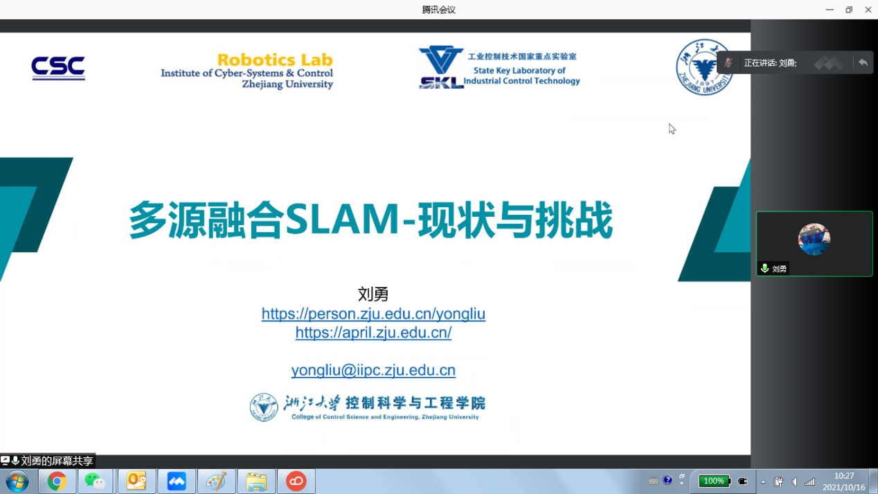 浙江大学刘勇教授作“多源融合SLAM-现状与挑战”报告。刘勇教授介绍了SLAM技术的诞生以及应用背景,并针对目前SLAM在应对无纹理等复杂环境上面临的挑战,分享了团队在多源传感器融合、几何语义信息融合等多源信息融合SLAM关键技术上的最新成果与思考。