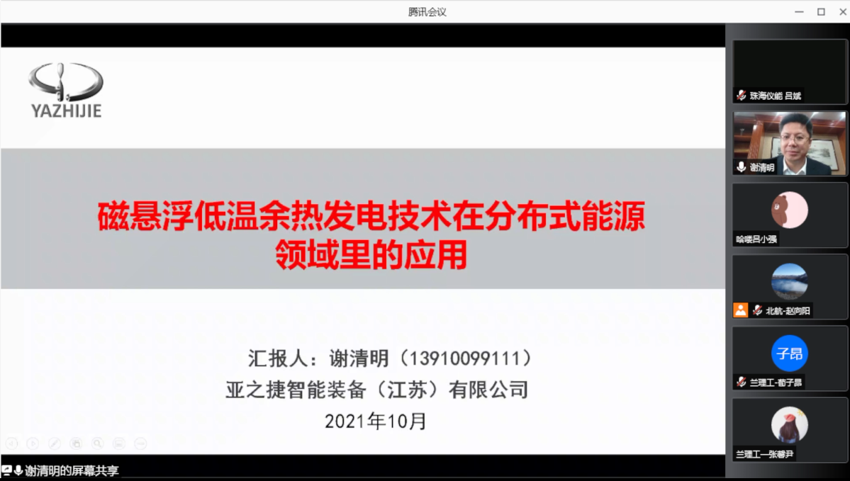 亚之捷智能装备(江苏)有限公司谢清明总经理作题为“磁悬浮低温余热发电技术在分布式能源领域里的应用”的报告。报告指出磁悬浮低温余热发电技术可以将蒸汽轮机无法回收的工业废热回收发电。产品采用先进的永磁偏置磁悬浮轴承技术、高效向心涡轮技术、高速永磁同步电机及控制技术、高效复叠循环利用技术和多领域半实物仿真技术,具有高效率、免维护、长寿命等特点。该产品通过将工业低温废热与有机工质换热,形成高压有机工质蒸气,吹动涡轮做功发电。并指出该技术是分布式能源技术的一个重要发展方向,既能变废为宝,又能减少排放,产品在不改变用户原生产工艺的前提下,进行废热回收,可以广泛适用于高能耗行业。