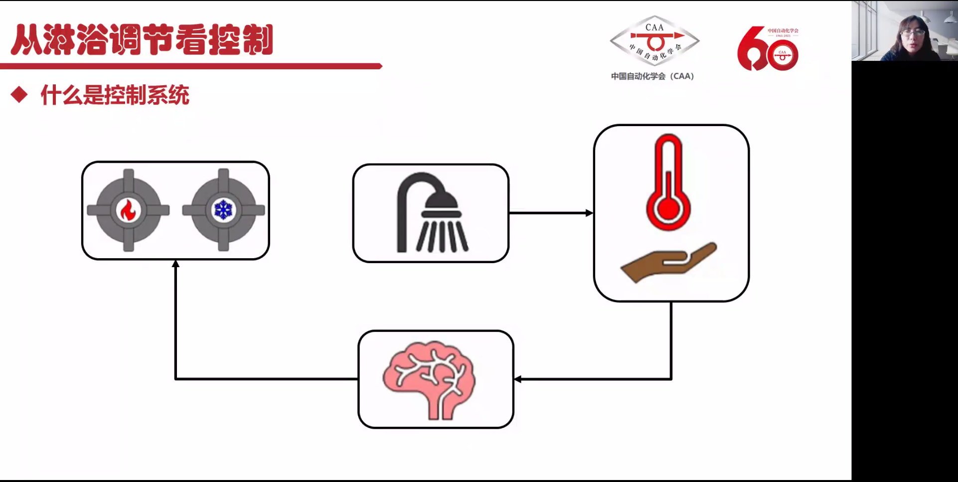 首先,吉林大学郭洪艳教授作题为“从淋浴调节看控制”的报告。郭洪艳教授从淋浴中的水温调节入手,介绍了控制系统的基本理论和组成要素,通过列举生活中的实例,让孩子们掌握控制器、传感器、执行器等概念。