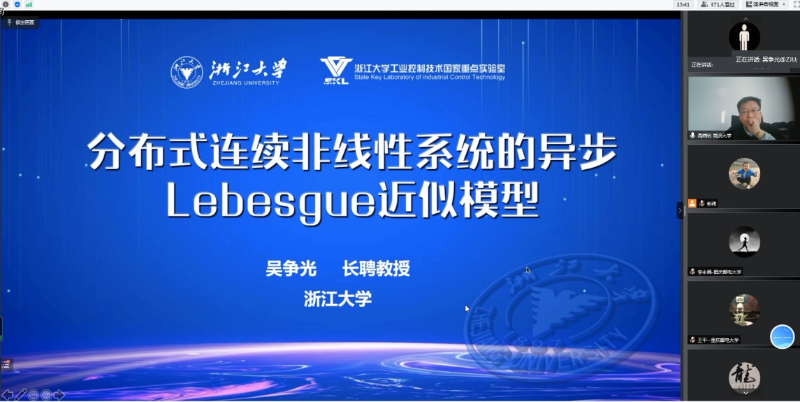 第二位报告人为来自浙江大学的吴争光教授,报告题目为“分布式连续非线性系统的异步Lebesgue近似模型”。报告中,针对数字化的工作环境中的离散时间模型,吴争光教授介绍了分布式Lebesgue近似模型,分析了该模型的性能,给出了Lebesgue近似模型渐近稳定、近似误差有界、避免出现Zeno行为的条件,最后通过仿真实验验证了模型的有效性。