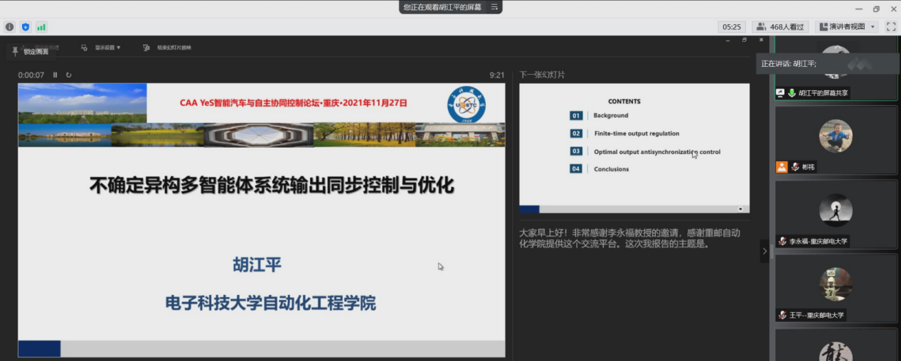 第三位报告人为来自电子科技大学的胡江平教授,报告题目为“不确定异构多智能体系统输出同步控制与优化”。报告中,胡江平教授首先针对一类异构多智能体系统输出调节问题,提出了外部系统的固定时间观测器,进一步给出了基于前馈控制的有限时间反馈控制设计与分析。然后,针对一类不确定异构多智能体系统介绍基于输入-输出信息的分布式输出同步优化分析方面的研究结果。利用输入输出信息对智能体状态进行重构,建立重构系统的最优控制指标函数,采用近似动态规划方法得到近似最优控制,最后通过强化学习方法实现不依赖系统矩阵信息的最优输出反同步控制。