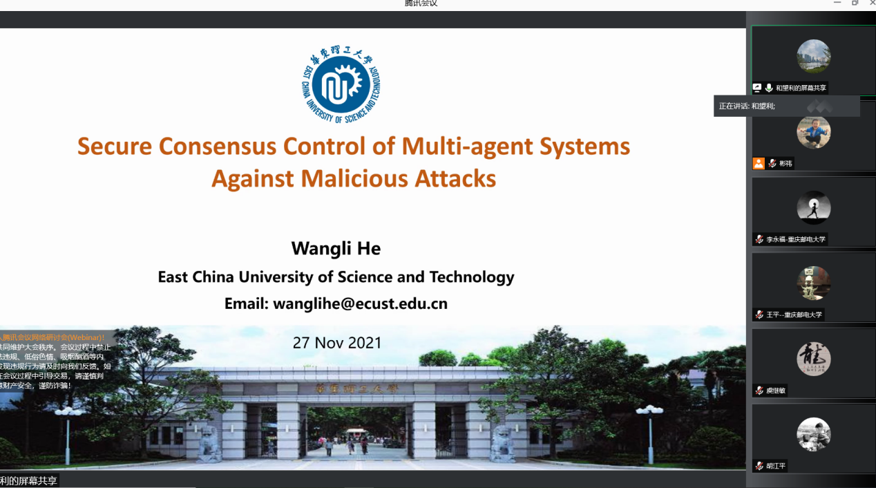 第五位报告人为来自华东理工大学的和望利教授,报告题目为“多智能体系统分布式协同控制”。报告中,针对如何在保证协同性能的同时有效降低智能体间的通讯能耗与如何设计有效的弹性协同控制策略以保证系统安全、稳定运行这两个问题,和望利教授介绍了一种分布式协同控制算法,并在仿真环境下对算法进行了验证,取得了良好的效果。