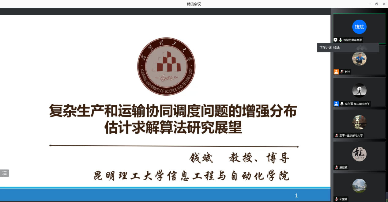 第六位报告人位来自昆明理工大学的钱斌教授,报告题目为“复杂生产和运输协同调度问题的增强分布估计求解算法研究展望”,在报告中,钱教授详细阐述了关于复杂系统的研究现状和不足,并提出了相应的解决方案。报告最后,钱教授介绍了其团队情况和未来的工作规划。