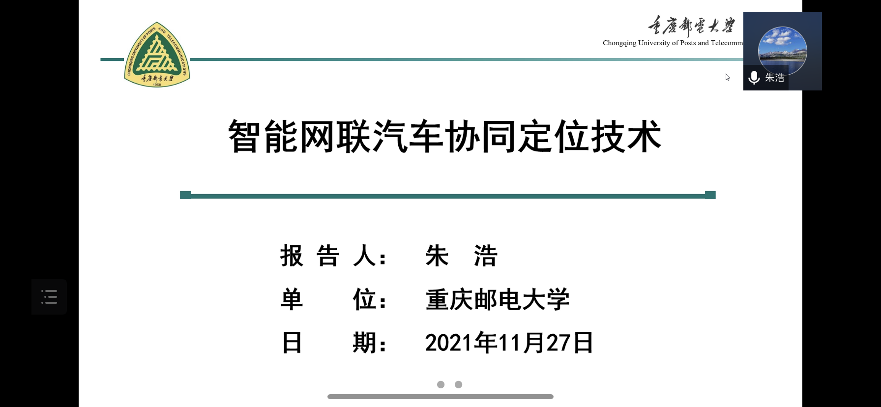 第八位报告人是来自重庆邮电大学的朱浩教授,报告题目是“智能网联汽车协同定位技术”。在报告中,针对智能网联汽车在真实交通环境下所面临的定位失效问题,提出了考虑时变非高斯噪声下的单车定位,网联环境下多车数据传输存在未知丢包、延时的多车定位,以及多传感器融合的智能网联汽车协同定位算法,并进行实验验证,取得了较好的结果。