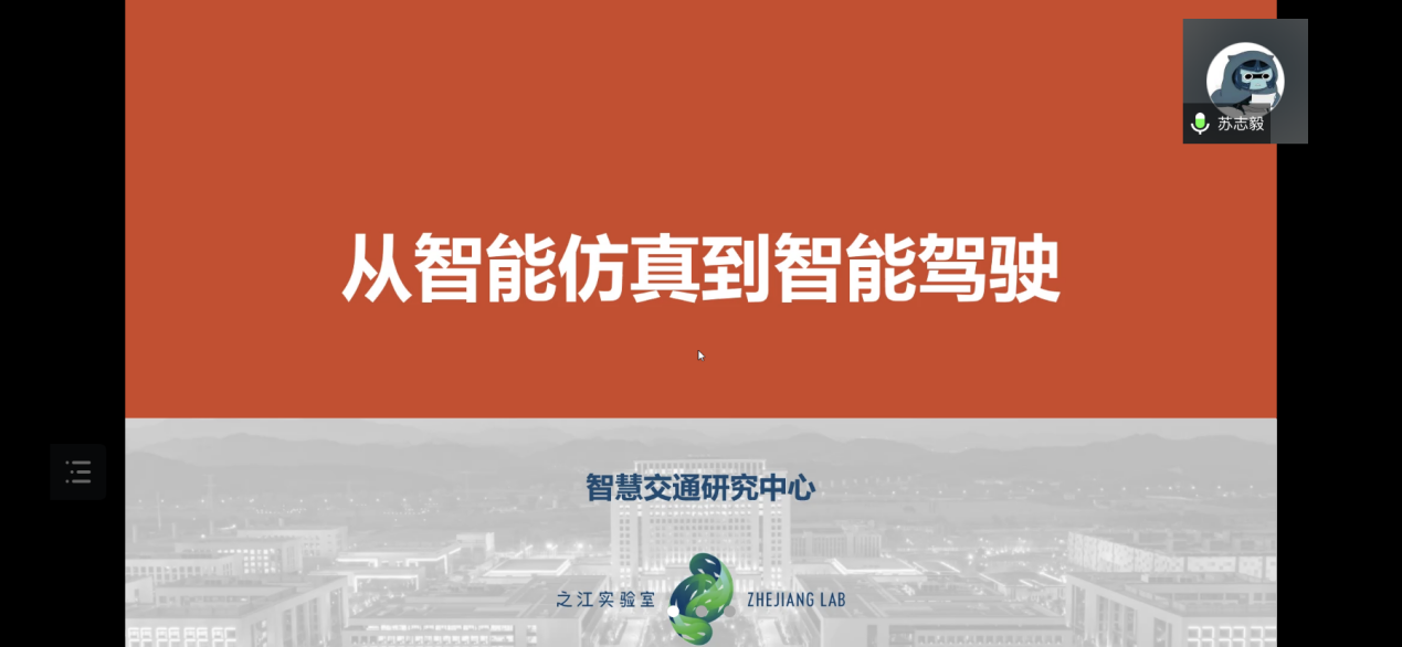 第九位报告人是来自之江实验室的苏志毅博士,报告题目是“从智能仿真到智能驾驶”。报告中苏志毅博士向我们介绍了他们实验室发布的智能驾驶虚拟仿真与测试平台,该平台可以不断迭代提升智能驾驶算法能力,在降低测试训练成本的同时极大提高测试训练的效率和效果。苏志毅博士还向我们介绍了他们项目中研究车路协同自主驾驶、协同操作系统、云端测试训练、智能监控运营等一系列关键技术。