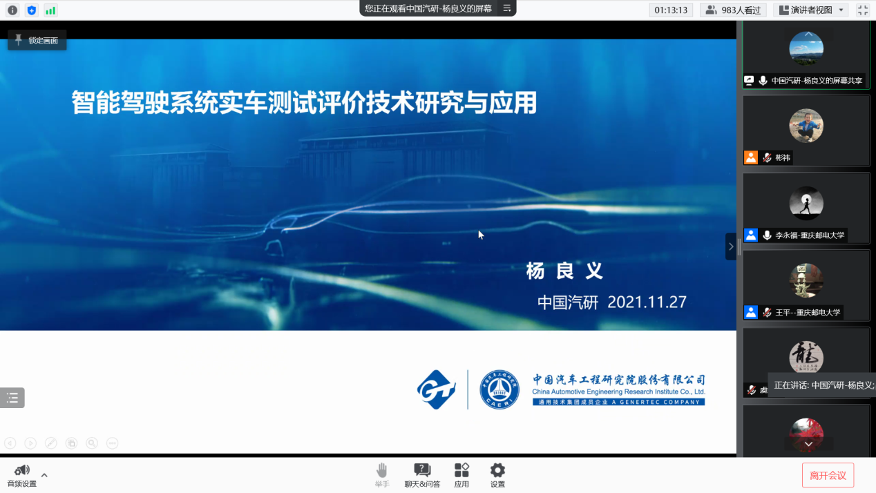 第十位报告人为来自中国汽车工程研究院股份有限公司的杨良义博士,报告题目为“智能驾驶系统实车测试评价技术研究与应用”。报告中,讨论了基于中国道路交通环境特征、自然驾驶行为和智能驾驶系统功能定义,研究智能驾驶系统测试场景库、封闭场地测试技术、开放道路测试技术和车辆主观评价方法,并将相关实车测试评价技术应用于智能网联汽车智能驾驶系统测试验证。