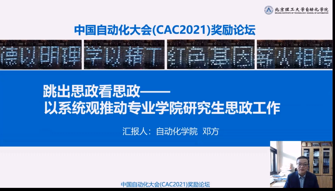 中国自动化学会副秘书长、CAA高等教学成果奖获得者、北京理工大学教授邓方作了题为“跳出思政看思政——以系统观推动专业学院研究生思政工作”的报告,从形式环境、对象群体、机制体制、标准评价四个方面分析了研究生思政工作的问题,提出从人才培养全过程和双一流建设角度统筹思政教育,从时间和空间两个维度采取措施深入改革思政工作。