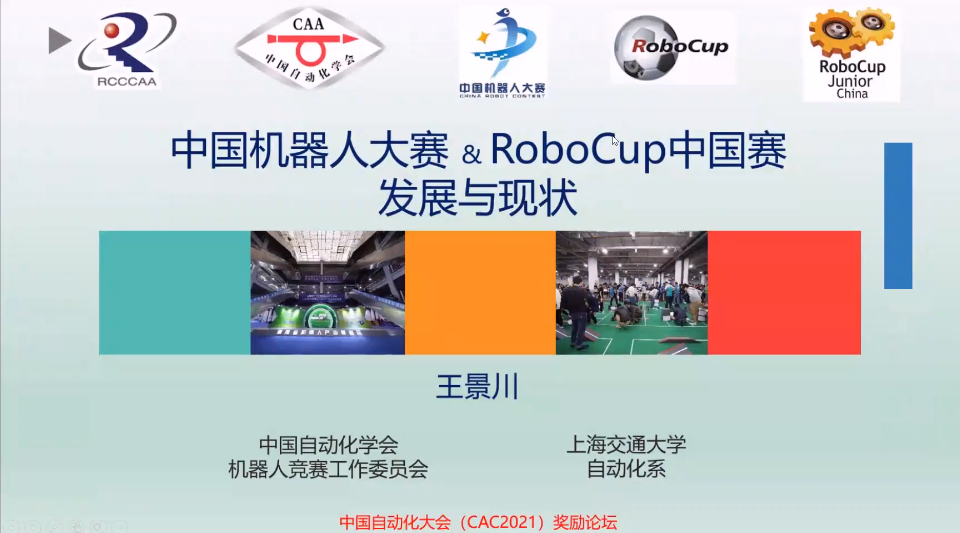 CAA科普奖获得者、上海交通大学研究员王景川的报告题目为“中国机器人大赛&RoboCup中国赛发展与现状”。报告从中国机器人大赛的历史、赛项介绍、组织模式展开介绍,围绕各高校在机器人竞赛、教学实践、课程改革等方面的成果,探讨机器人科技竞赛与实践教学改革经验。