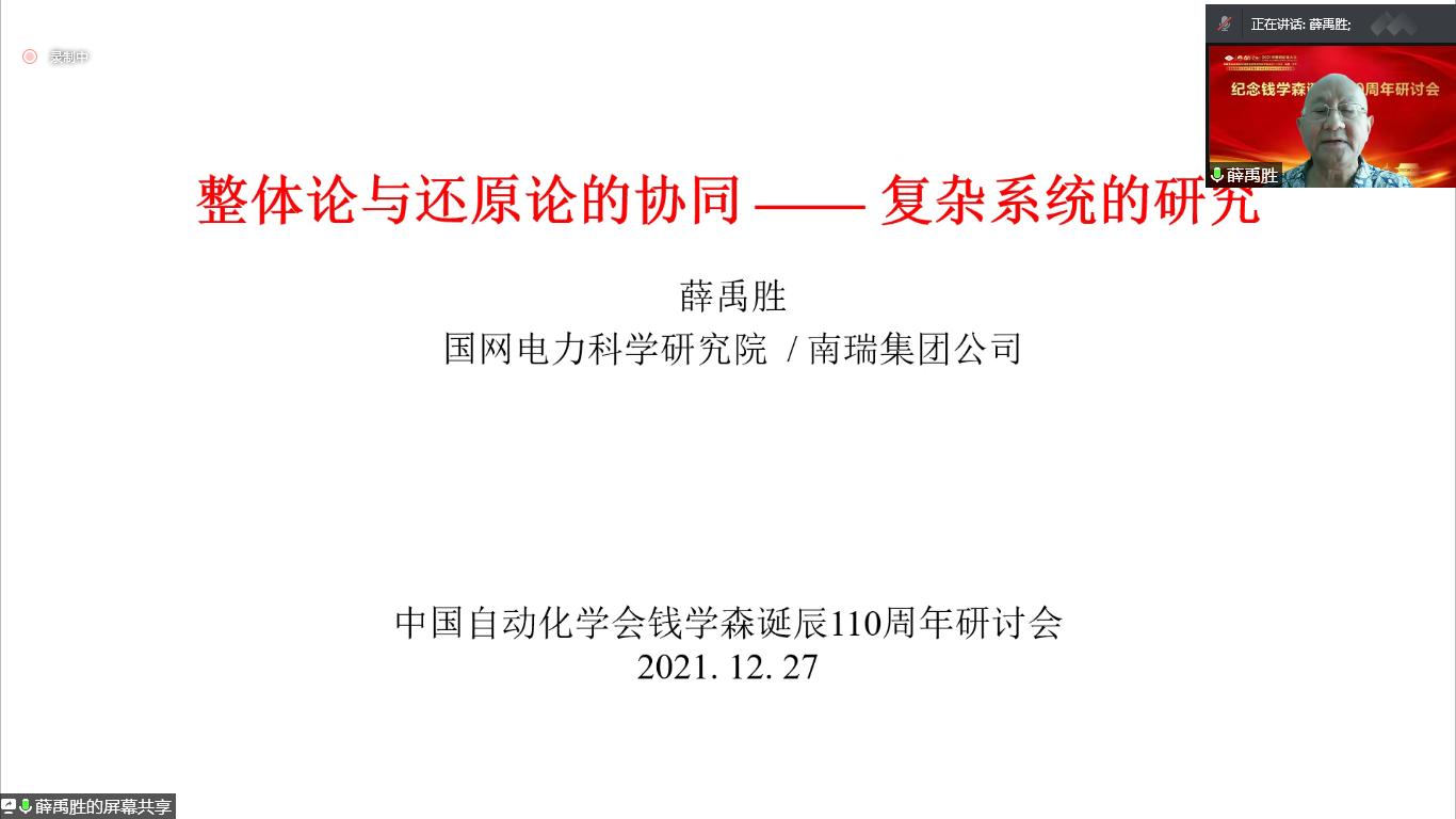 2021年12月27日下午,中国自动化学会主办的纪念钱学森诞辰110周年研讨会以线上线下结合的形式成功召开。中国工程院院士、中国自动化学会理事长、西安交通大学教授郑南宁院士,国网电力科学研究院名誉院长薛禹胜院士,中国自动化学会监事长、中国科学院自动化研究所王飞跃研究员等人出席此次会议。会议由中国自动化学会副理事长、中国科学院自动化研究所侯增广研究员主持,万余人次线上观看了此次会议。