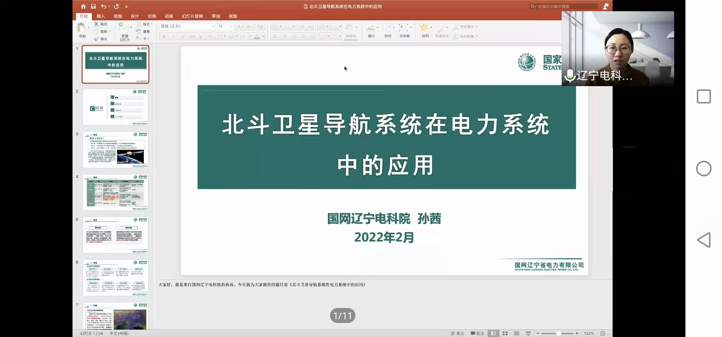 第七位报告人为来自国家电网辽宁省电科院的孙茜工程师,报告题目为“北斗卫星导航系统在电力系统中的应用”。在提供高精度、高可靠定位、导航、授时服务中,北斗卫星导航系统占据着重要的地位。从运检、安质和营销三个专业内的典型业务出发,报告人介绍了北斗卫星导航系统在电力系统中的关键应用,探索了二者融合应用的新模式。