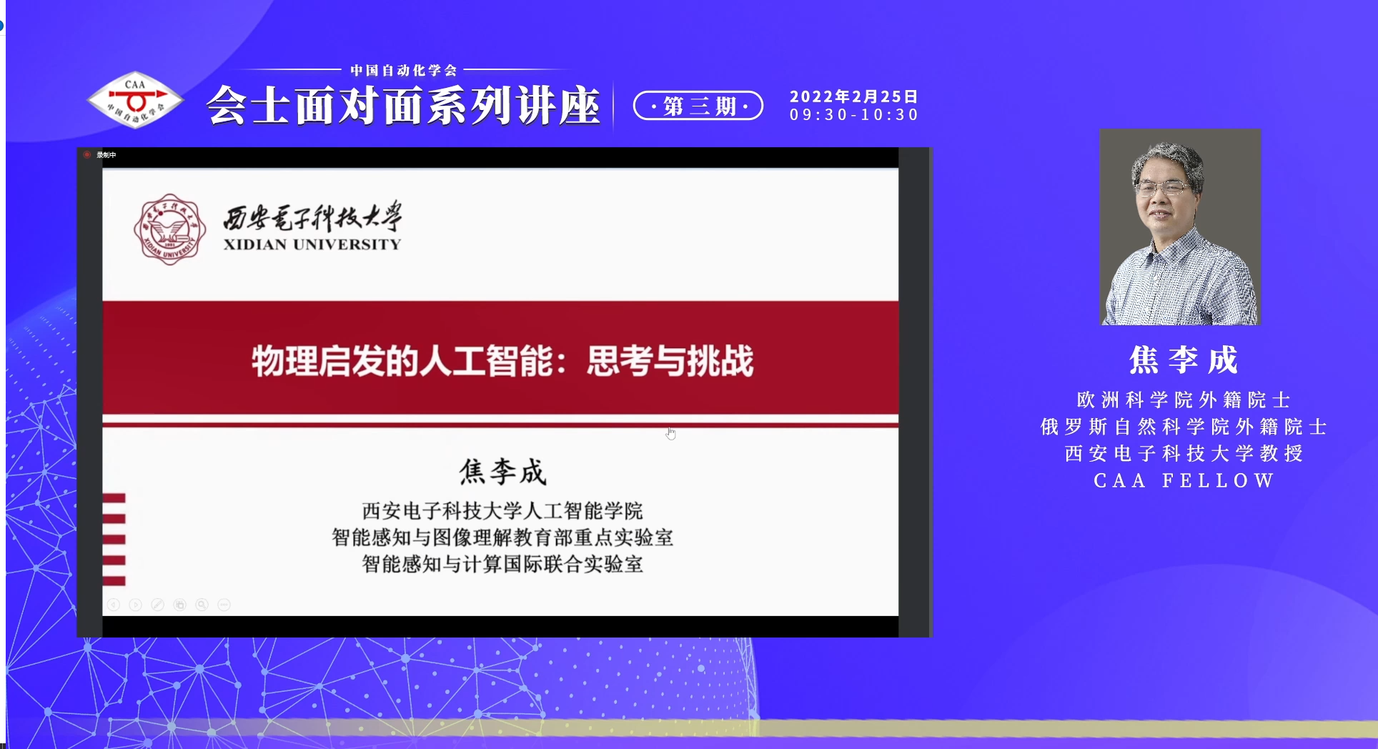 第三期会士面对面于2022年2月25日上午成功召开,西安电子科技大学焦李成教授作题为“物理启发的人工智能:挑战与思考”的报告。焦李成教授在报告中指出,新一轮科技革命和产业变革蓬勃兴起,一些基本科学问题孕育重大突破,可望催生新的重大科学思想和科学理论,产生颠覆性技术。人工智能技术作为当今社会的主要生产力,也发挥了巨大的作用。在诸多行业和领域取得了非常显著的成效,同时具有巨大的潜力。焦老师的报告旨在探索物理学与人工智能算法的内涵和发展,重点讨论了目前物理学原理与想象与人工智能算法的研究进展,结合团队在该方向的具体工作,给出了对未来发展的一些思考。