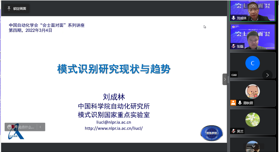 第四期会士面对面于2022年3月4日上午成功召开,中国自动化学会会士,中国科学院自动化研究所副所长、模式识别国家重点实验室主任,中国科学院大学人工智能学院副院长刘成林作题为“模式识别研究现状与趋势”的报告。