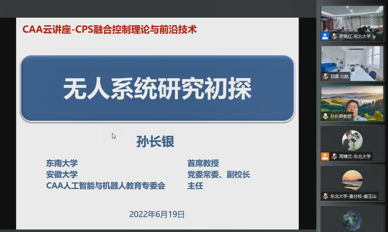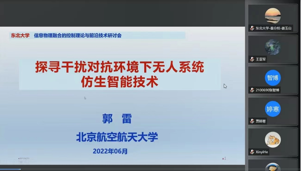 为更好地探讨国际学术前沿研究、把握新一轮技术和产业变革先机,提升我国科技创新水平,由中国自动化学会主办,中国自动化学会信息物理系统控制与决策专业委员会和中国自动化学会能源互联网专业委员会共同承办的CAA云讲座“信息物理融合的控制理论与前沿技术论坛”2022年6月19日以线上线下混合会议的形式在东北大学开展并取得圆满成功,论坛特邀了北京航空航天大学郭雷教授、北京理工大学夏元清教授、华中科技大学曾志刚教授、安徽大学孙长银教授和东南大学虞文武教授作专题报告,线上线下同步观看近八万人次。中国自动化学会信息物理系统控制与决策专业委员会主任杨光红教授和中国自动化学会能源互联网专业委员会主任张化光教授共同担任本次论坛主席,东北大学智能科学与技术研究院副院长杨东升教授担任论坛组织主席,报告主持人分别由东北大学杨东升教授、罗艳红研究员、王占山教授、叶丹教授和周博文副教授担任。