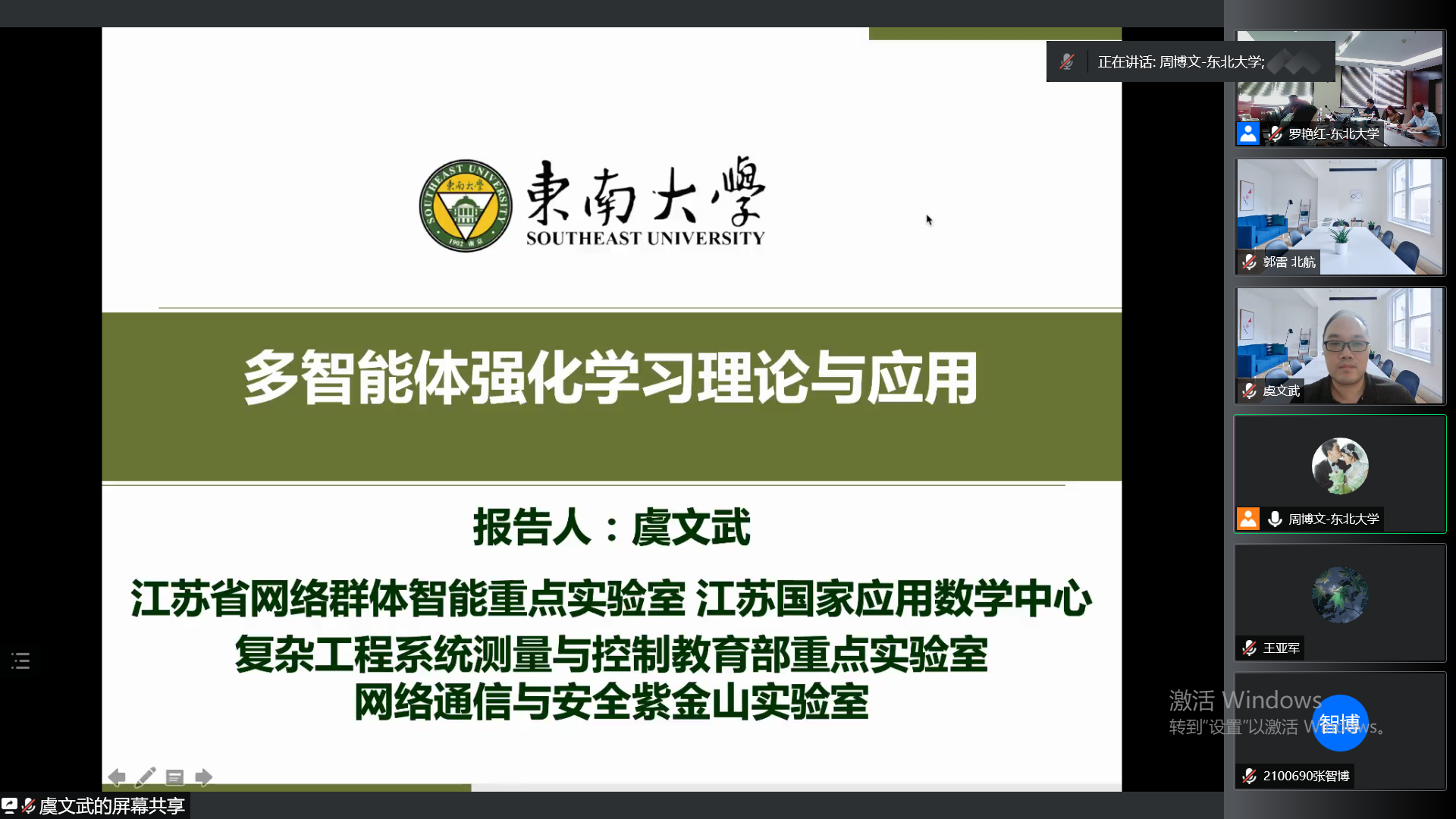 安徽大学孙长银教授做了题为《无人系统的控制研究初探》的报告,孙教授指出如何将复杂模型求解方法和拟合能力引入开放、不确定、脆弱的无人系统控制中,是人工智能研究热点和难点问题。孙教授首先从俄乌战争背景入手,指出当前自主无人系统面临的一些技术局限,并概述了在下一代超视距战争模式下,如何实现无人系统的复杂任务的分解;如何在单个个体成员数量动态变化的系统中实现深度强化学习技术,并构建新旧智能体之间的知识迁移模型,有效指导新智能体的探索方向;如何构建跨任务迁移学习新算法,实现任务之间的知识迁移和多无人系统的高效探索,完成复杂任务的快速求解。