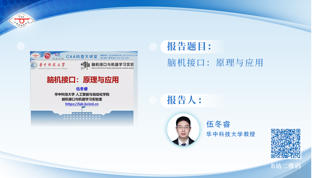 [嘉宾简介】伍冬睿,华中科技大学人工智能与自动化学院教授、博导,图像信息处理与智能控制教育部重点实验室副主任,国家海外青年高层次人才。主要研究方向为脑机接口、机器学习、智慧医疗等。发表论文200余篇,其中SCI 95篇(一作35篇,IEEE汇刊65篇),ESI高引9篇,谷歌学术总引用9900余次(H=51),爱思唯尔中国高被引学者。授权国际专利5项,中国发明专利13项,转让4项。两个一作算法进入Matlab Fuzzy Logic Toolbox。获4个青年科学奖(2021中国自动化学会青年科学家奖,2020 USERN Prize in Formal Sciences,2017 IEEE系统、人和控制论学会首届青年科学家奖,2014 北美模糊信息处理学会首届青年科学家奖),6个杰出论文奖(2021 IEEE 神经系统与康复工程汇刊最佳论文奖,2020 IEEE 机电一体化与自动化会议最佳论文奖,2014 IEEE 模糊系统汇刊杰出论文奖,2012 IEEE 计算智能学会杰出博士论文奖,等),2019-2022连续四年世界机器人大赛--BCI脑控机器人大赛技术赛全国一等奖或特等奖,2022湖北青年五四奖章,等。现任IEEE SMC学会助理副主席、管理委员会委员和eNewsLetter主编,及3个IEEE汇刊副编。2023年起将担任IEEE模糊系统汇刊(IF=12.253)主编。