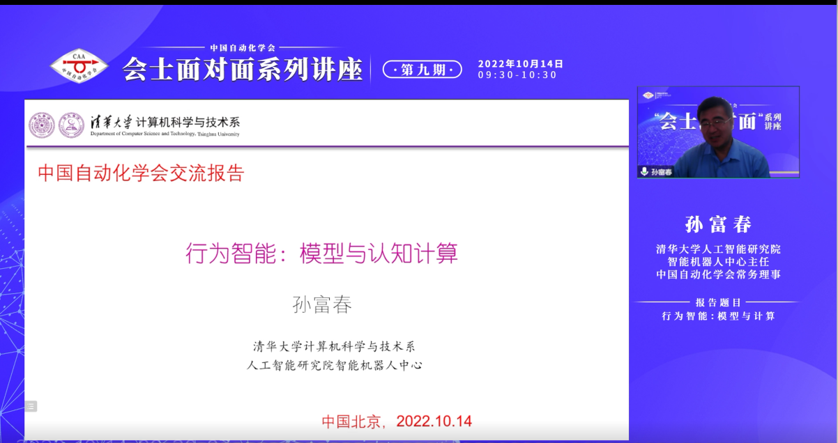 第九期会士面对面讲座于2022年10月14日上午成功召开,中国自动化学会常务理事、会士、清华大学计算机科学与技术系长聘教授委员会副主任孙富春教授作题为“行为智能:模型与计算”的报告。