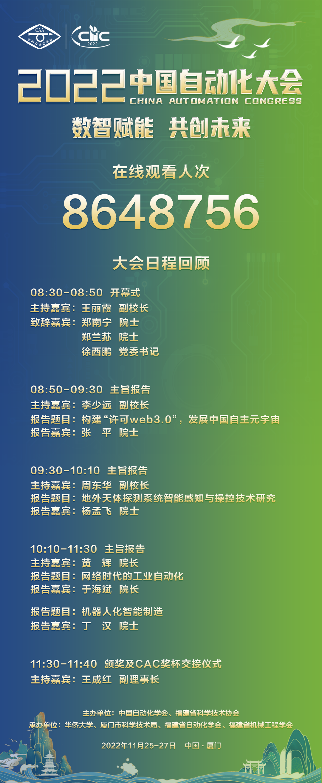 大会总主席、中国工程院院士、中国自动化学会理事长、西安交通大学教授郑南宁,中国工程院院士、中国自动化学会特聘顾问、中国科学院沈阳自动化所研究员王天然,中国工程院院士、中国自动化学会副理事长、中南大学教授桂卫华,中国科学院院士、福建省科学技术协会主席郑兰荪,中国工程院院士、北京邮电大学教授张平,中国科学院院士、中国自动化学会副理事长、中国空间技术研究院研究员杨孟飞,中国科学院院士、华中科技大学教授丁汉,中国工程院院士、中国自动化学会副理事长、同济大学校长陈杰,华侨大学党委书记徐西鹏,中国自动化学会监事长、中国科学院自动化所研究员王飞跃,中国自动化学会副理事长王成红,中国自动化学会副理事长、中国科学院沈阳分院院长于海斌,中国自动化学会副理事长、上海交通大学教授、青岛科技大学副校长李少远,中国自动化学会副理事长、山东科技大学副校长周东华,中国自动化学会副理事长、华南理工大学教授陈俊龙,中国自动化学会副理事长、冶金设计研究院有限公司院长、中国钢研科技集团有限公司党委副书记张剑武,中国自动化学会副理事长、中国科学院自动化所研究员侯增广,中国自动化学会副理事长、中国科学院数学与系统科学研究院研究员张纪峰,福建省科学技术协会二级巡视员杨采薇,厦门市科技局局长孔曙光等以线上线下方式出席会议。