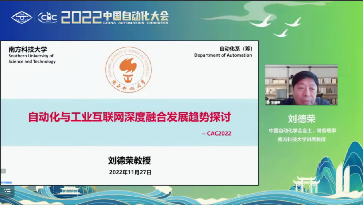欧洲科学院院士、中国自动化学会常务理事、南方科技大学讲席教授刘德荣,作题为“自动化与工业互联网深度融合发展趋势探讨”的大会报告。报告围绕平行控制、云控制、网络化控制、自适应动态规划等理论展开,讨论了未来智能制造自动化与工业互联网的高度融合发展在社会治理、公共服务、经济金融、自动驾驶、安全、教育、投资等领域的巨大潜力。