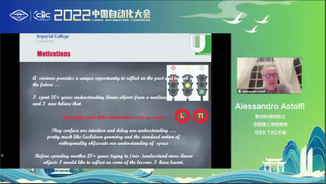 欧洲科学院院士、帝国理工学院教授、IEEE TAC主编Alessandro Astolfi作题为“The curse of linearity and time-invariance”的大会报告,报告主要介绍分析了线性时不变系统。