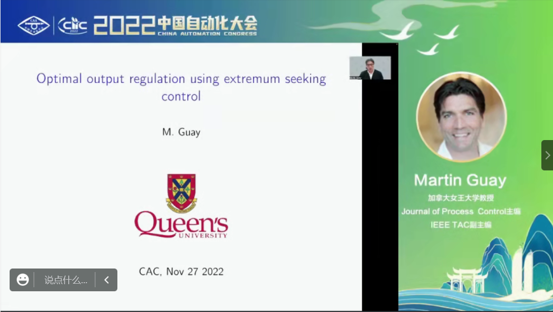 加拿大女王大学教授、Journal of Process Control主编、IEEE TAC副主编Martin Guay作题为“Output regulation of uncertain systems using extremum seeking control“的大会报告。报告主要分享了极值搜索控制如何实现对最优条件的调节,以应对未知环境的影响,同时讨论极值搜索控制在高空伪卫星上的具体应用。