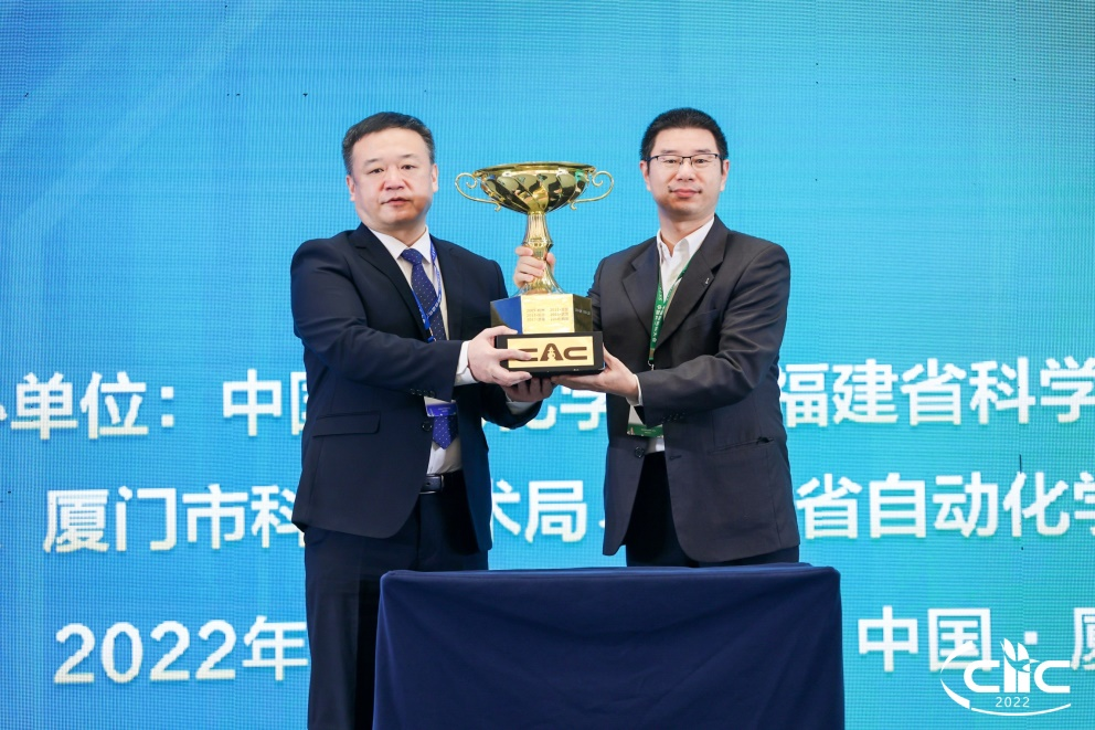 大会同期进行了“CAC杯”交接仪式,2022中国自动化大会组委会代表——华侨大学机电及自动化学院院长黄辉,将沉甸甸的“CAC杯”郑重转交给2023中国自动化大会组委会代表——重庆邮电大学袁荣棣教授。2022中国自动化大会将于2023年11月在山城重庆召开,续写自动化大会新篇章。