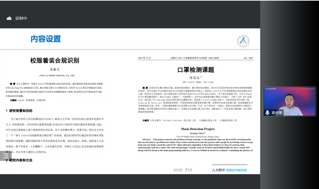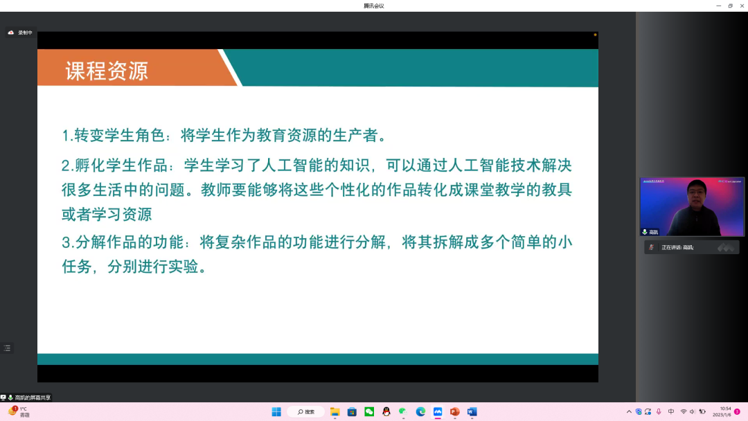 6日下午,大会继续进行。CAA 普及工作委员会委员张梦晗老师对2022年的AICE测评工作做了总结汇报,并对2023年的规划做了预告。随后,2022年AICE四期测评中的优秀学生代表及其辅导老师做了分享。AICE 测评工作组的祝泽程老师讲解了AICE进阶提高阶段D/E 项目的辅导与评审流程,上海市徐汇中学的胡奕铭同学介绍了自己参加测评的人工智能项目,上海爱砺锋科创中心的黄波曲老师分享了D/E 模块的辅导经验,养蕊老师分享了中小学生创新思维及创新技术培养的经验和心得。