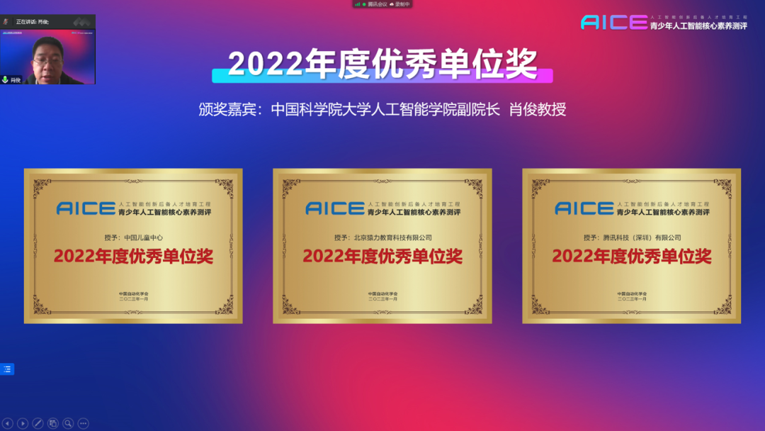 随后,大会进行了线上颁奖,中国科学院大学人工智能学院的肖俊院长和西安交通大学计算机学院的田峰教授先后宣读了各个奖项的获奖名单和获奖理由(见文末)。任赟、贾志勇、刘俊英等20位老师获得了AICE年度优秀个人贡献奖。霍颖怡、徐启发、马文杰等20位老师获得了AICE2022年度优秀辅导师;华中师范大学第一附属中学、澳门培正中学、北京市八一学校等15家学校被授予AICE2022年度共建特色校;中国儿童中心、北京猿力教育科技有限公司、腾讯科技(深圳)有限公司获得了AICE测评2022年度优秀单位贡献奖;三象教育(鲸桥编程)、剡锋教育、西安运营中心、辽宁运营中心、武汉运营中心等10单位获得AICE2022年度优秀组织单位奖;徐启发、任赟、刘俊英三位老师代表获奖老师和获奖单位发表了获奖感言。来自猿编程的刘俊英老师表示,希望培养孩子们的科技视野,让孩子去关注当前科技的发展,理解科技对于当下和未来的影响,进而具备更广阔的对于未来科技的视野。