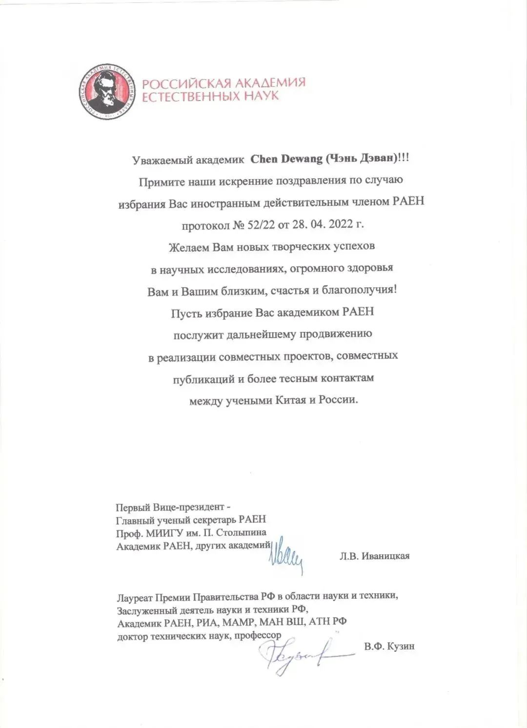 近日,俄罗斯自然科学院(Russian Academy of Natural Sciences,RANS)主席库兹尼科夫院长和第一副主席兼秘书长伊娃尼茨卡娅向中国自动化学会平行控制与管理专业委员会副主任、普及工作委员会副主任、福建工程学院交通运输学院院长陈德旺教授发来贺信,祝贺陈德旺教授当选俄罗斯自然科学院外籍院士,充分肯定他在可解释人工智能、模糊系统、智能交通系统、智慧轨道交通等领域的研究贡献。