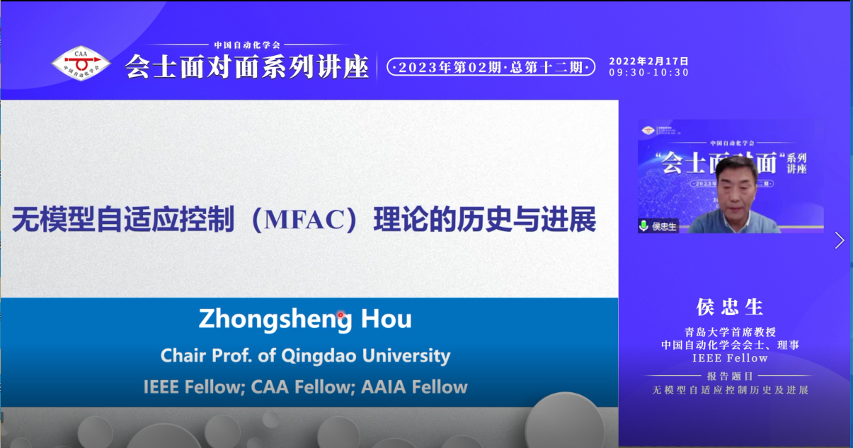 2023年第二期(总第十二期)会士面对面讲座于2023年2月17日上午成功召开,中国自动化学会会士,理事、IEEE Fellow、青岛大学首席教授侯忠生作题为“无模型自适应控制历史及进展”的报告。