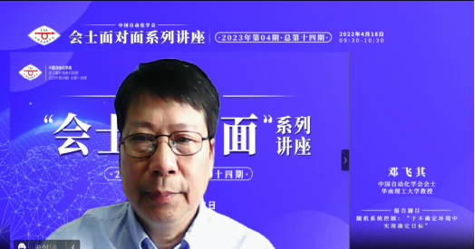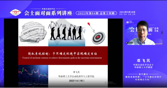 2023年第四期(总第十四期)会士面对面讲座于2023年4月18日上午成功召开,中国自动化学会会士、华南理工大学邓飞其教授,将带来题为“随机系统控制:于不确定环境中实现确定目标”的报告。