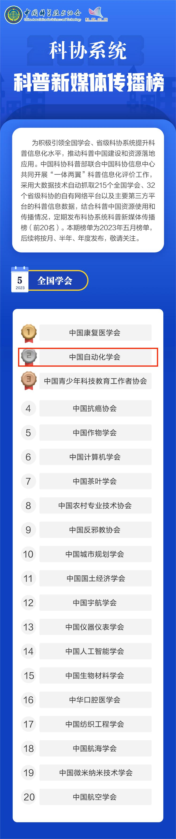 中国自动化学会在排行榜中位列第二!