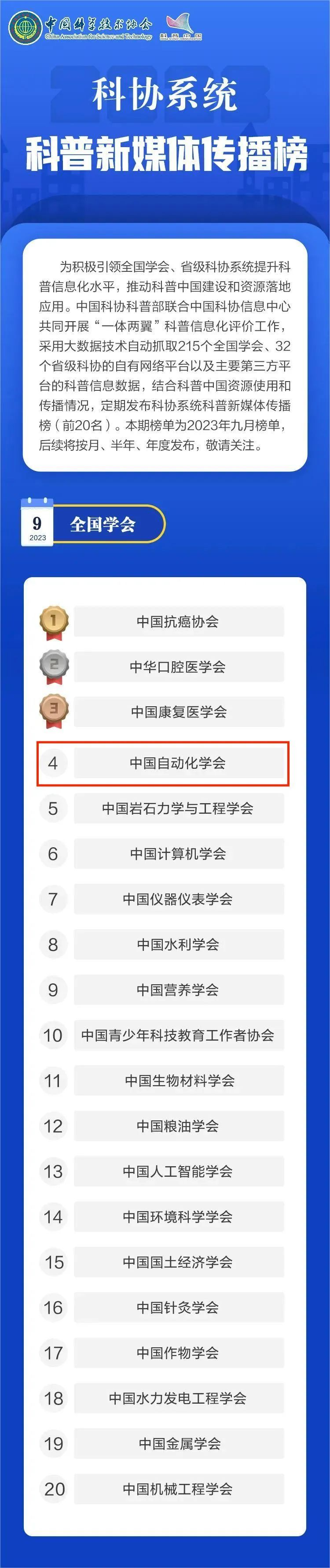 近日,中国科协发布9月科协系统科普新媒体传播榜。中国科协科普部联合中国科协信息中心共同开展“一体两翼”科普信息化评价工作,采用大数据技术自动抓取215个全国学会、32个省级科协的自有网络平台以及主要第三方平台的科普信息数据,结合科普中国资源使用和传播情况,定期发布科协系统科普新媒体传播榜(前20名)。