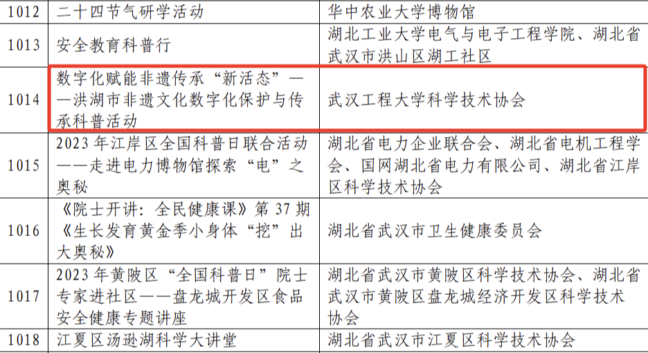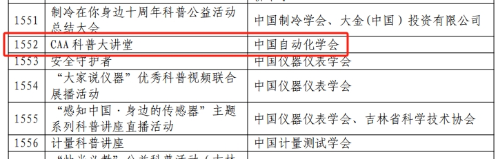 为激励先进,树立典型,推动全国科普日活动创新发展,按照《关于举办2023年全国科普日活动的通知》(科协发普字〔2023〕34号)有关要求,经中国科学技术协会综合评议,评出1465个单位为2023年全国科普日优秀组织单位、1749个活动为2023年全国科普日优秀活动。其中,中国自动化学会被评为2023年全国科普日优秀组织单位,CAA科普大讲堂和中国自动化学会推荐的武汉工程大学科学技术协会作品数字化赋能非遗传承“新活态”——洪湖市非遗文化数字化保护与传承科普活动被评为2023年全国科普日优秀活动。