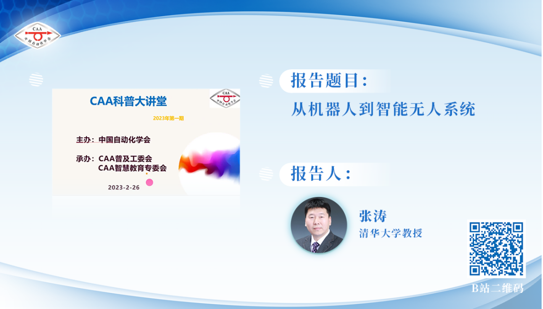 CAA科普大讲堂活动是中国自动化学会特面向学生会员、广大科技工作者及社会公众推出科普活动,每期活动邀请1位或数位学会会士进行专题报告,充分利用全媒体矩阵,开展自动化、信息化,人工智能与机器学习等领域的科技知识普及,增强社会大众对科技创新知识的了解,激发对科学的热情和兴趣,弘扬科学精神,提升科学素养,积极打造学会学术、科普比翼齐飞新格局。2023年,学会线上共举办8期CAA科普大讲堂,CAA整理了所有报告人授权的直播回放资源,长按识别海报中的二维码进入B站查看视频回放。