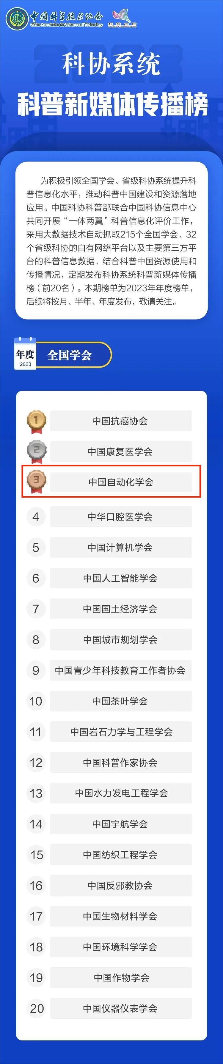 今日,中国科协发布2023年度科协系统科普新媒体传播榜。中国科协科普部联合中国科协信息中心共同开展“一体两翼”科普信息化评价工作,采用大数据技术自动抓取215个全国学会、32个省级科协的自有网络平台以及主要第三方平台的科普信息数据,结合科普中国资源使用和传播情况,定期发布科协系统科普新媒体传播榜(前20名)。本期榜单为2023年年度榜单。
