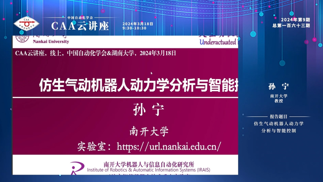 2024年3月18日南开大学教授孙宁做客CAA云讲座并作题为“仿生气动机器人动力学分析与智能控制”的报告。