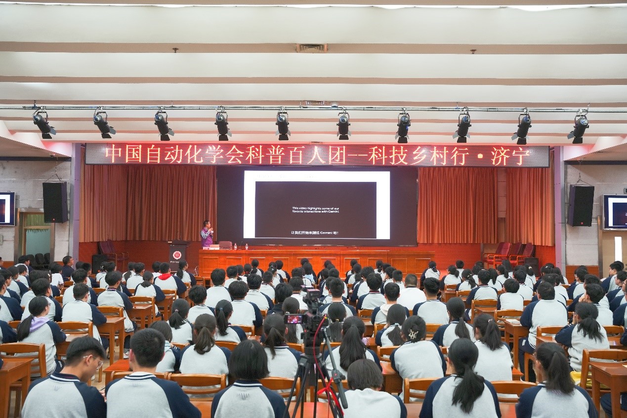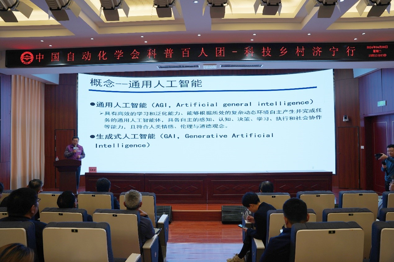 为落实《关于新时代进一步加强科学技术普及工作的意见》和国家乡村振兴战略,开展科技助力乡村振兴行动,2024年4月9日,中国自动化学会在济宁市成功开展了第一期“科普百人团—科技乡村行”系列活动。本次活动由中国自动化学会主办,中国自动化学会普及工作委员会、中国自动化学会智慧教育专业委员会联合承办,中国自动化学会AICE测评工作组协办。本次活动走进济宁市第一中学任城校区、济宁市实验中学、任城区干部夜校,为乡村师生讲授人工智能通识、前沿与发展相关课程,激发青少年对人工智能的学习兴趣,提高科技教师对智能时代青少年AI核心素养培育的紧迫感与使命感。