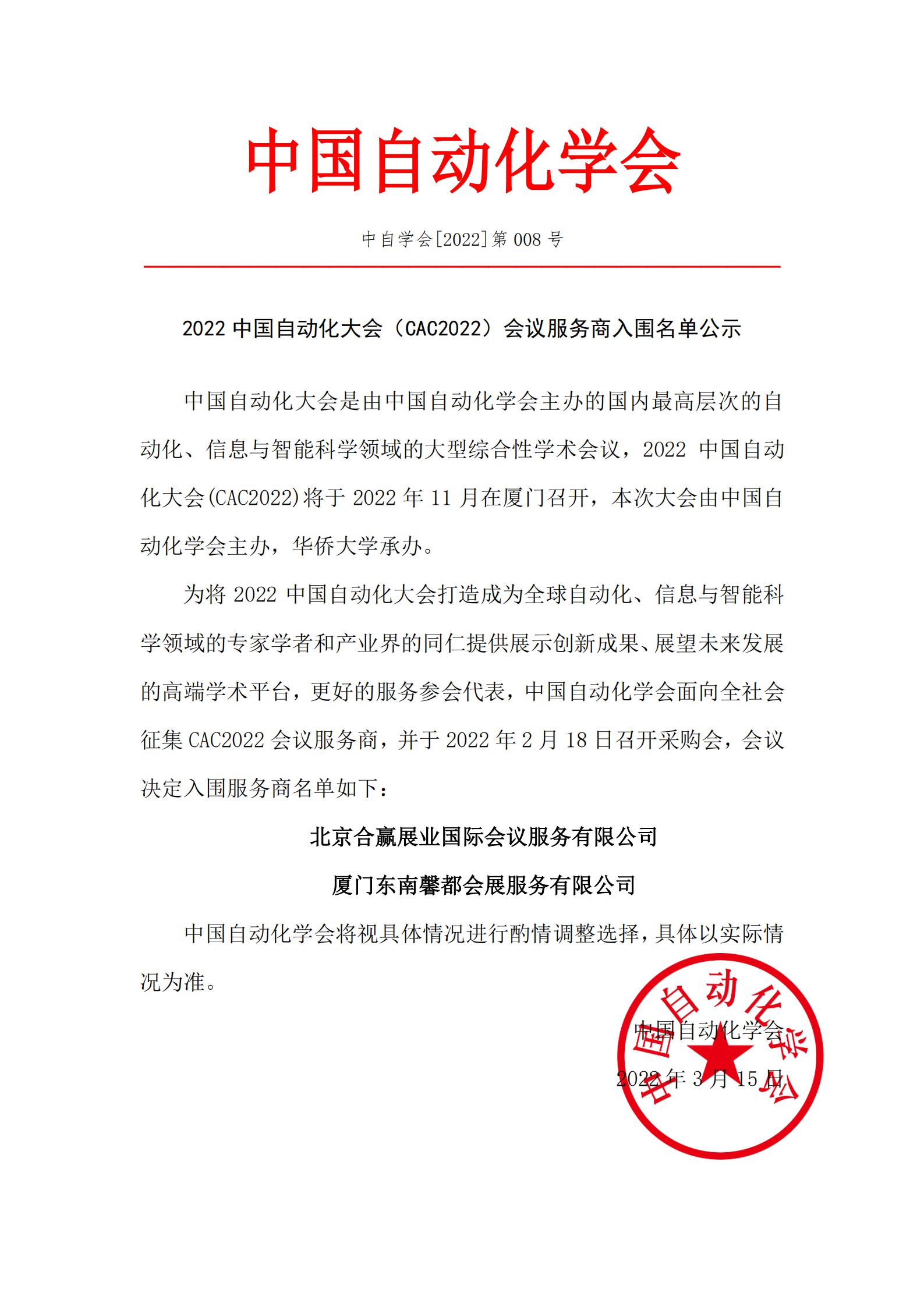 为将2022中国自动化大会打造成为全球自动化、信息与智能科学领域的专家学者和产业界的同仁提供展示创新成果、展望未来发展的高端学术平台,更好的服务参会代表,中国自动化学会面向全社会征集CAC2022会议服务商,并于2022年2月18日召开采购会,会议决定入围服务商名单如下: