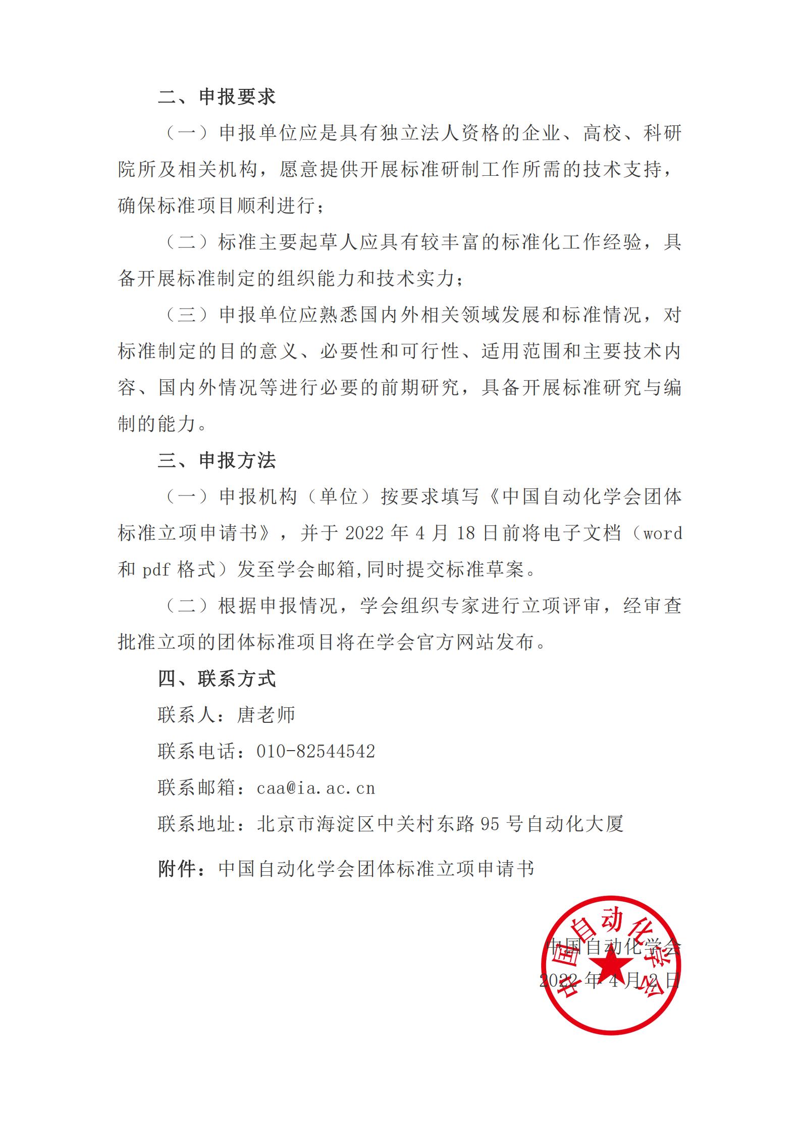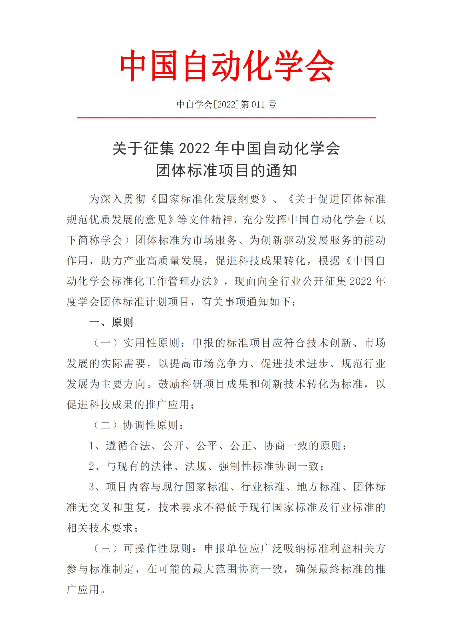为深入贯彻《国家标准化发展纲要》、《关于促进团体标准规范优质发展的意见》等文件精神,充分发挥中国自动化学会(以下简称学会)团体标准为市场服务、为创新驱动发展服务的能动作用,助力产业高质量发展,促进科技成果转化,根据《中国自动化学会标准化工作管理办法》,现面向全行业公开征集2022年度学会团体标准计划项目,有关事项通知如下: