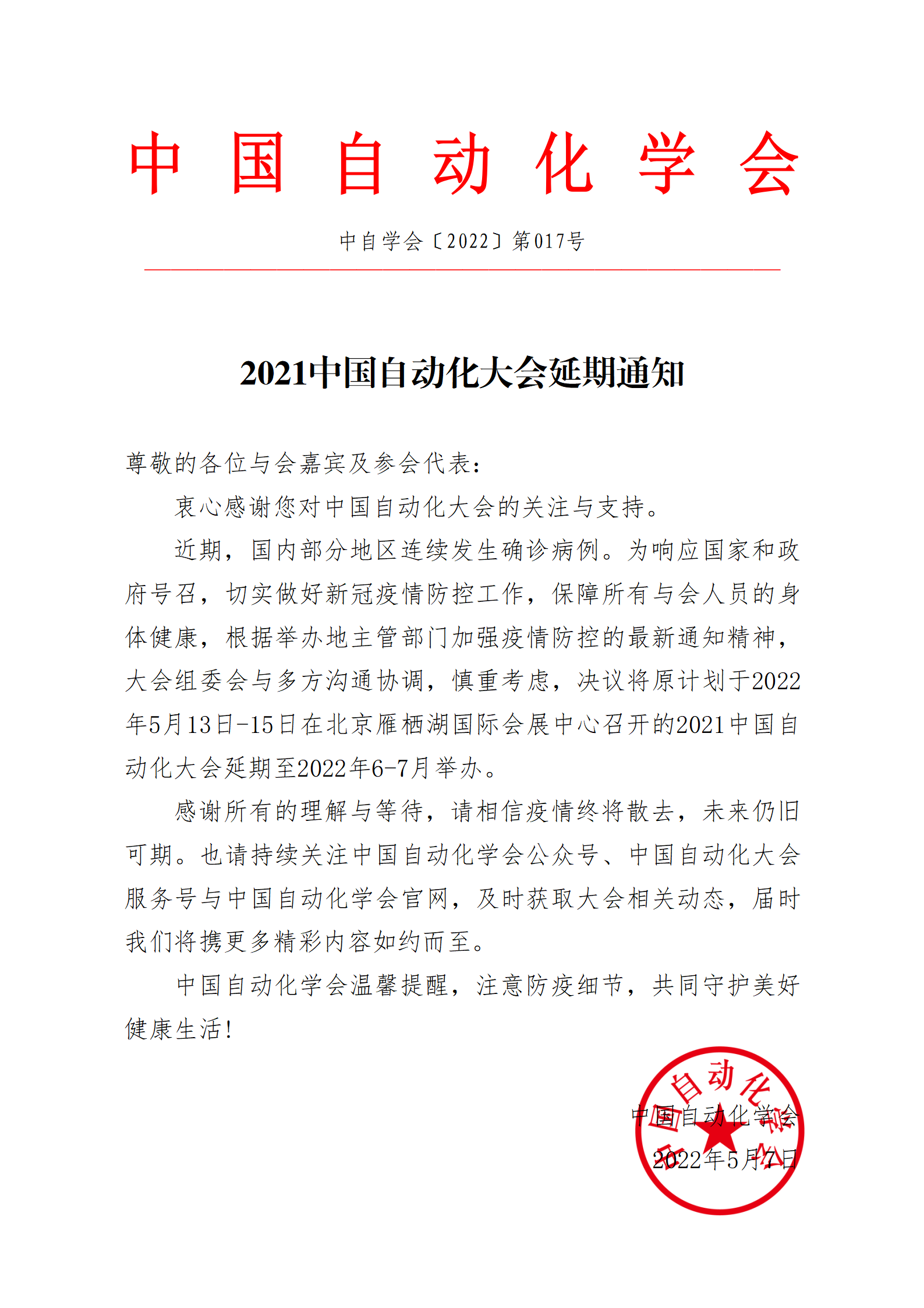 近期,国内部分地区连续发生确诊病例。为响应国家和政府号召,切实做好新冠疫情防控工作,保障所有与会人员的身体健康,根据举办地主管部门加强疫情防控的最新通知精神,大会组委会与多方沟通协调,慎重考虑,决议将原计划于2022年5月13日-15日在北京雁栖湖国际会展中心召开的2021中国自动化大会延期至2022年6-7月举办。